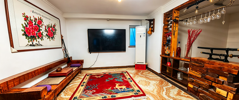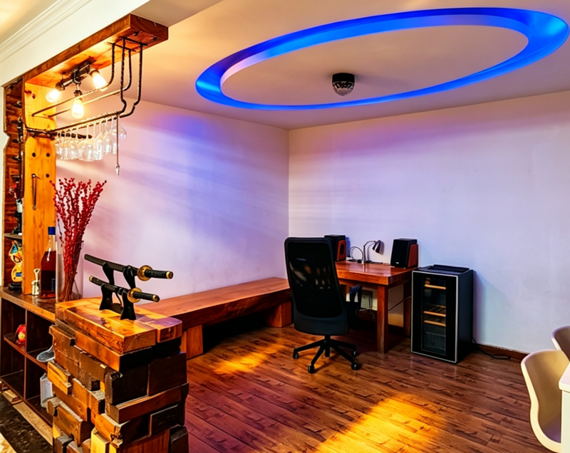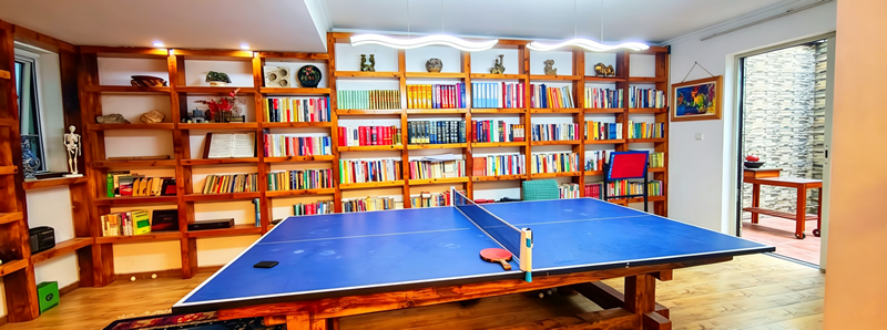房子楼下底跃空间,更是把慢生活拉满。打造了独立家庭图书馆,千余册藏书整齐陈列,闲暇时沉浸在墨香里,静心独处、沉淀身心,格外惬意。全屋核心陈设均为天然整木打造,两张实木大茶台质感厚重,会客品茶氛围感拉满;还有整块原木精工制作的乒乓球桌,卸下球桌面板,就是4.2平米的超大实木台面,天然纹理独一无二,休闲娱乐、家庭聚会、商务会客都适配。